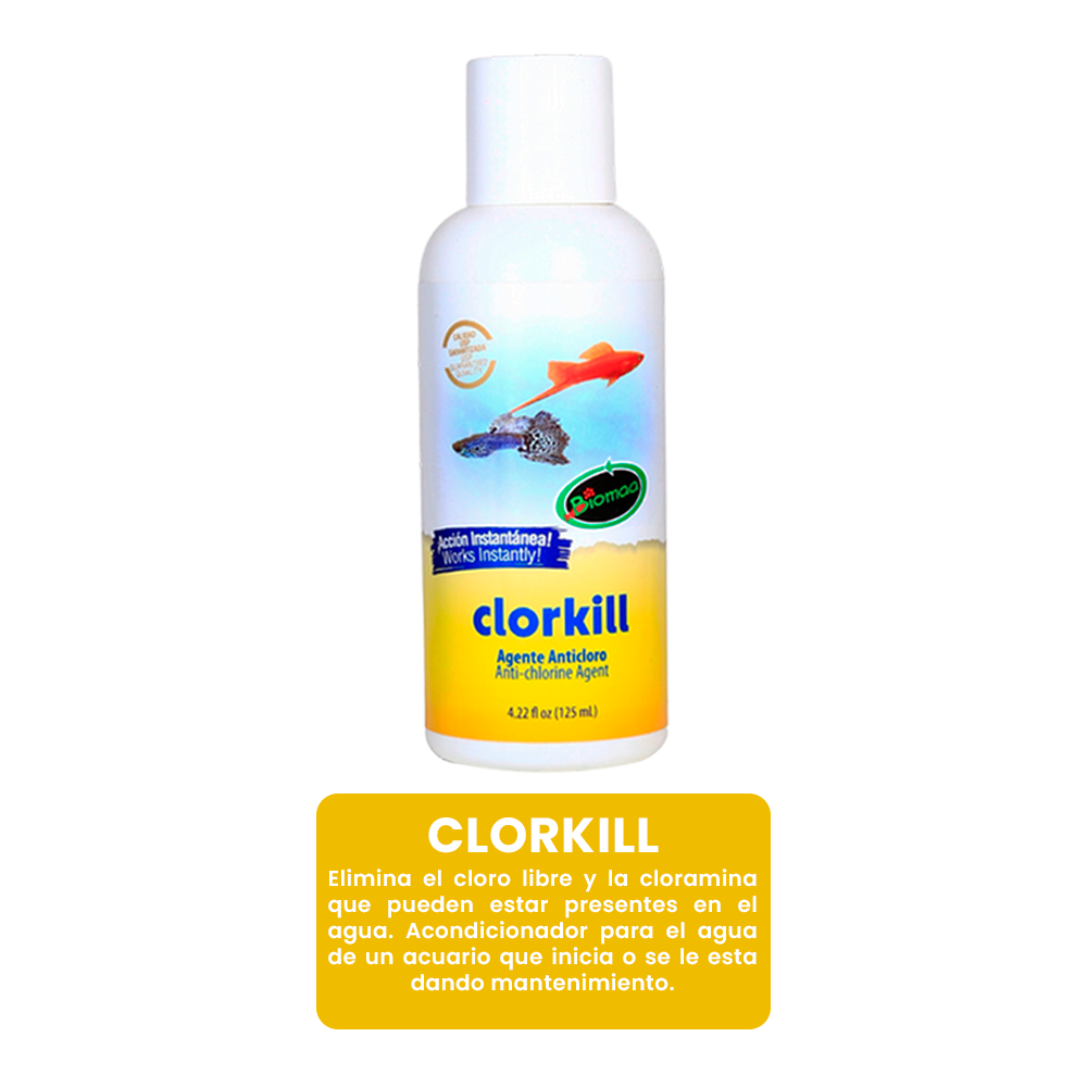 CLORKILL elimina el cloro libre y la cloramina que pueden estar presentes en el agua. Acondicionador para el agua de un acuario que inicia o se le esta dando mantenimiento.