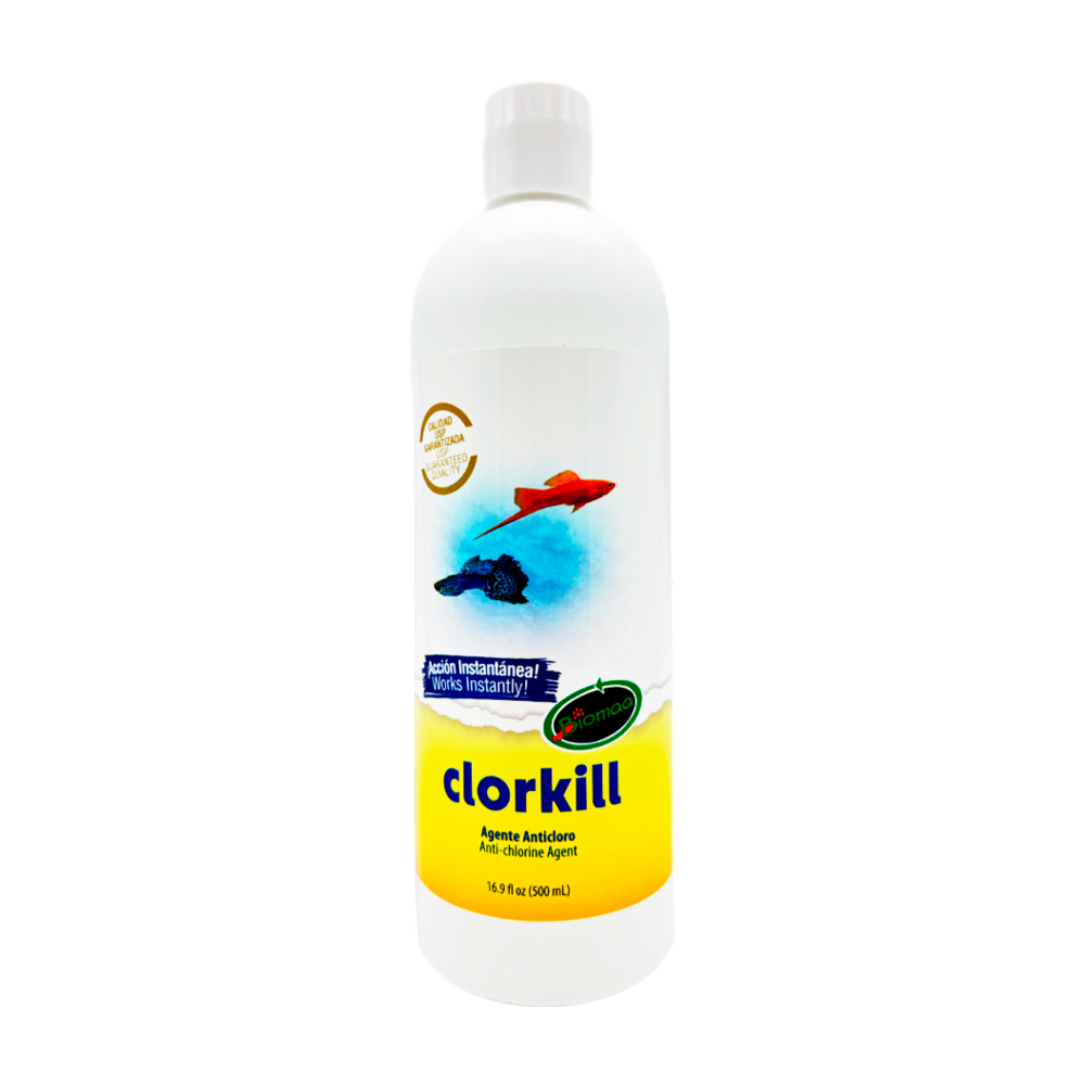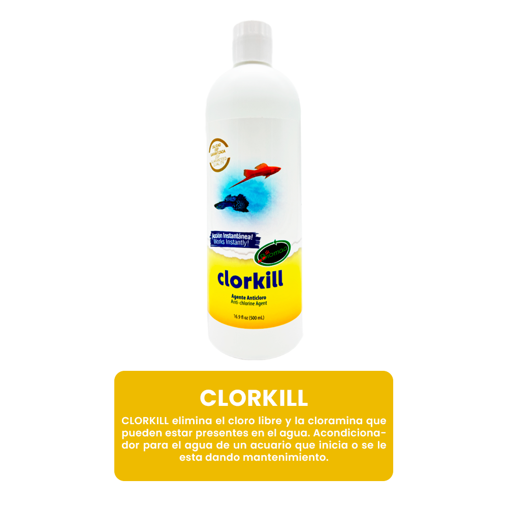 CLORKILL elimina el cloro libre y la cloramina que pueden estar presentes en el agua. Acondicionador para el agua de un acuario que inicia o se le esta dando mantenimiento.