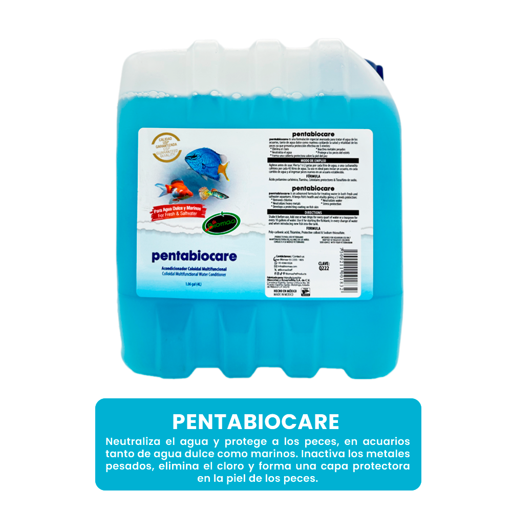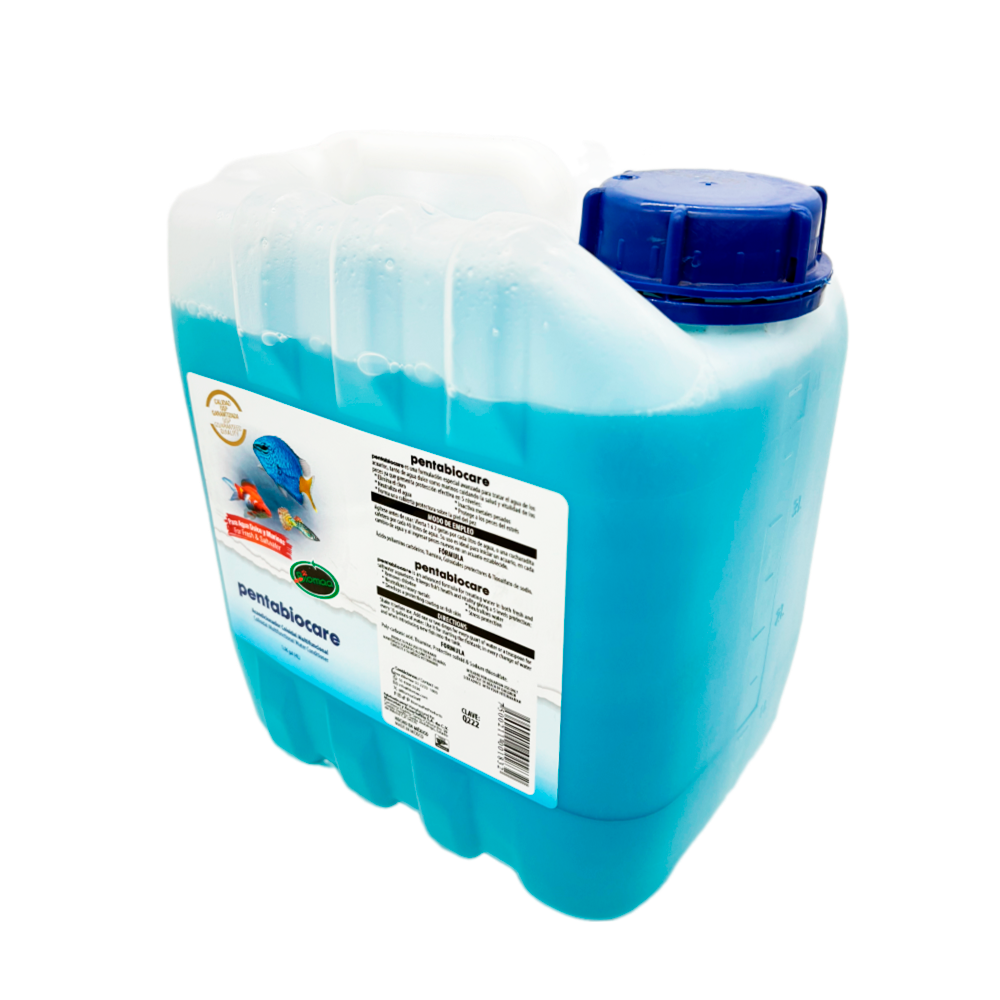 - 4L PENTABIOCARE neutraliza el agua y protege a los peces, en acuarios tanto de agua dulce como marinos. Inactiva los metales pesados, elimina el cloro y forma una capa protectora en la piel de los peces.