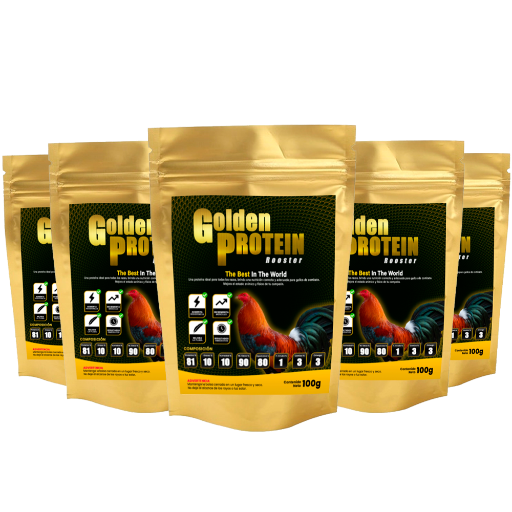 PAQUETE CON 5 BOLSAS DE 100G C/U EN TOTAL 500G DE PROTEÍNA PARA GALLOS O GALLINAS “GOLDEN PROTEIN ROOSTER”